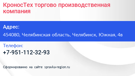КроносТех, торгово-производственная компания по адресу 454080, Челябинская область, Челябинск, Южная, 4в в дальнейшем Организация, размещена в следующих категориях: