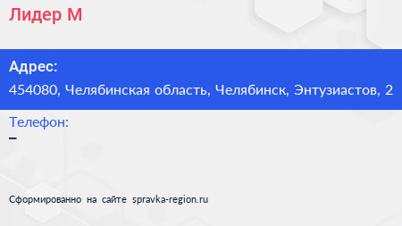 Лидер-М по адресу 454080, Челябинская область, Челябинск, Энтузиастов, 2 в дальнейшем Организация, размещена в следующих категориях: