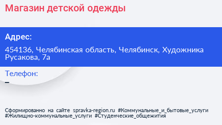 Магазин детской одежды по адресу 454136, Челябинская область, Челябинск, Художника Русакова, 7а в дальнейшем Организация, размещена в следующих категориях: