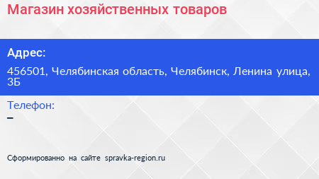 Магазин хозяйственных товаров по адресу 456501, Челябинская область, Челябинск, Ленина улица, 3Б в дальнейшем Организация, размещена в следующих категориях: