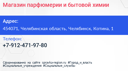 Магазин парфюмерии и бытовой химии по адресу 454071, Челябинская область, Челябинск, Котина, 1 в дальнейшем Организация, размещена в следующих категориях: