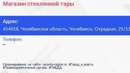 Магазин стеклянной тары по адресу 454018, Челябинская область, Челябинск, Отрадная, 25/11 в дальнейшем Организация, размещена в следующих категориях: