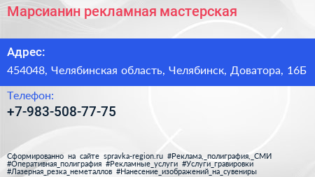 Марсианин, рекламная мастерская по адресу 454048, Челябинская область, Челябинск, Доватора, 16Б в дальнейшем Организация, размещена в следующих категориях: