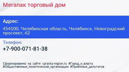 Мегапак, торговый дом по адресу 454100, Челябинская область, Челябинск, Новоградский проспект, 62 в дальнейшем Организация, размещена в следующих категориях: