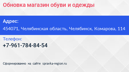 Обновка, магазин обуви и одежды по адресу 454071, Челябинская область, Челябинск, Комарова, 114 в дальнейшем Организация, размещена в следующих категориях: