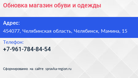 Обновка, магазин обуви и одежды по адресу 454077, Челябинская область, Челябинск, Мамина, 15 в дальнейшем Организация, размещена в следующих категориях: