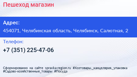 Пешеход, магазин по адресу 454071, Челябинская область, Челябинск, Салютная, 2 в дальнейшем Организация, размещена в следующих категориях: