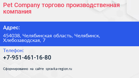 Pet Company, торгово-производственная компания по адресу 454038, Челябинская область, Челябинск, Хлебозаводская, 7 в дальнейшем Организация, размещена в следующих категориях: