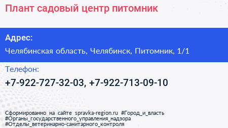 Плант, садовый центр-питомник по адресу Челябинская область, Челябинск, Питомник, 1/1 в дальнейшем Организация, размещена в следующих категориях: