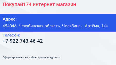 Покупай174, интернет-магазин по адресу 454046, Челябинская область, Челябинск, Артёма, 1/4 в дальнейшем Организация, размещена в следующих категориях: