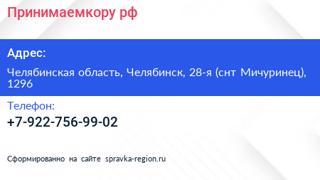 Принимаемкору.рф по адресу Челябинская область, Челябинск, 28-я (снт Мичуринец), 1296 в дальнейшем Организация, размещена в следующих категориях: