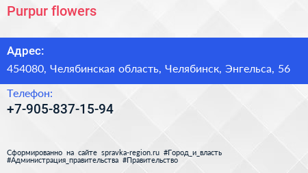 Purpur flowers по адресу 454080, Челябинская область, Челябинск, Энгельса, 56 в дальнейшем Организация, размещена в следующих категориях: