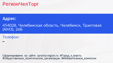 РегионЧелТорг по адресу 454028, Челябинская область, Челябинск, Трактовая (АМЗ), 26Б в дальнейшем Организация, размещена в следующих категориях: