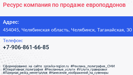 Ресурс, компания по продаже европоддонов по адресу 454045, Челябинская область, Челябинск, Таганайская, 30 в дальнейшем Организация, размещена в следующих категориях: