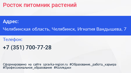 Росток, питомник растений по адресу Челябинская область, Челябинск, Игнатия Вандышева, 7 в дальнейшем Организация, размещена в следующих категориях: