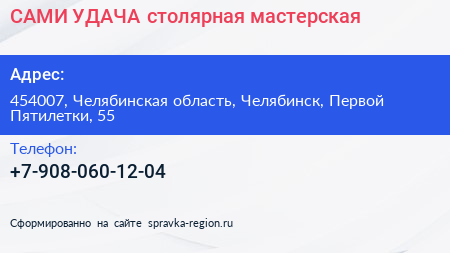 САМИ-УДАЧА, столярная мастерская по адресу 454007, Челябинская область, Челябинск, Первой Пятилетки, 55 в дальнейшем Организация, размещена в следующих категориях: