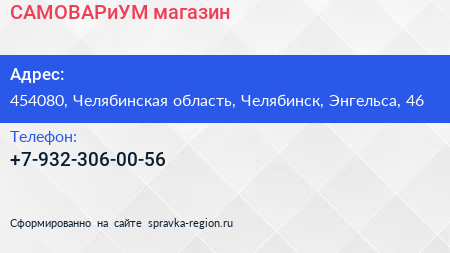 САМОВАРиУМ, магазин по адресу 454080, Челябинская область, Челябинск, Энгельса, 46 в дальнейшем Организация, размещена в следующих категориях: