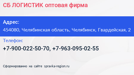 СБ-ЛОГИСТИК, оптовая фирма по адресу 454080, Челябинская область, Челябинск, Гвардейская, 2 в дальнейшем Организация, размещена в следующих категориях: