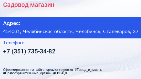 Садовод, магазин по адресу 454031, Челябинская область, Челябинск, Сталеваров, 37 в дальнейшем Организация, размещена в следующих категориях: