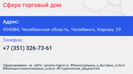 Сфера, торговый дом по адресу 454084, Челябинская область, Челябинск, Кирова, 19 в дальнейшем Организация, размещена в следующих категориях: