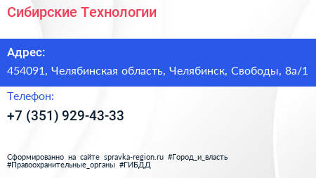 Сибирские Технологии по адресу 454091, Челябинская область, Челябинск, Свободы, 8а/1 в дальнейшем Организация, размещена в следующих категориях: