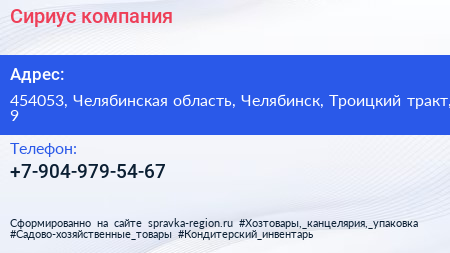 Сириус, компания по адресу 454053, Челябинская область, Челябинск, Троицкий тракт, 9 в дальнейшем Организация, размещена в следующих категориях: