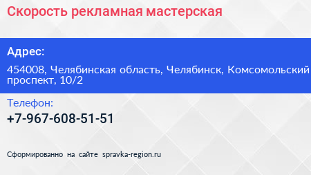 Скорость, рекламная мастерская по адресу 454008, Челябинская область, Челябинск, Комсомольский проспект, 10/2 в дальнейшем Организация, размещена в следующих категориях: