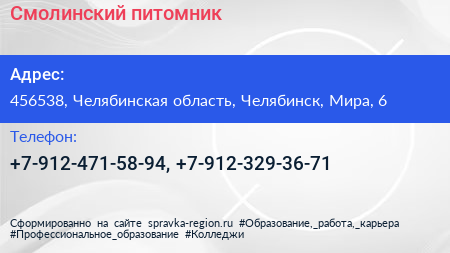 Смолинский питомник по адресу 456538, Челябинская область, Челябинск, Мира, 6 в дальнейшем Организация, размещена в следующих категориях:
