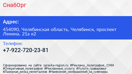 СнабОрг по адресу 454090, Челябинская область, Челябинск, проспект Ленина, 21а к2 в дальнейшем Организация, размещена в следующих категориях: