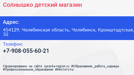 Солнышко, детский магазин по адресу 454129, Челябинская область, Челябинск, Кронштадтская, 32 в дальнейшем Организация, размещена в следующих категориях: