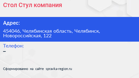 Стол-Стул, компания по адресу 454046, Челябинская область, Челябинск, Новороссийская, 122 в дальнейшем Организация, размещена в следующих категориях: