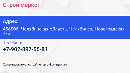Строй маркет по адресу 456506, Челябинская область, Челябинск, Новоградская, 4/5 в дальнейшем Организация, размещена в следующих категориях: