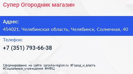 Супер Огородник, магазин по адресу 454021, Челябинская область, Челябинск, Солнечная, 40 в дальнейшем Организация, размещена в следующих категориях: