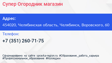 Супер Огородник, магазин по адресу 454020, Челябинская область, Челябинск, Воровского, 60 в дальнейшем Организация, размещена в следующих категориях: