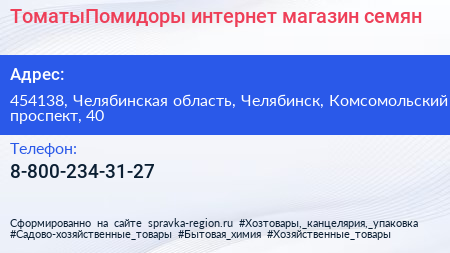 ТоматыПомидоры, интернет-магазин семян по адресу 454138, Челябинская область, Челябинск, Комсомольский проспект, 40 в дальнейшем Организация, размещена в следующих категориях: