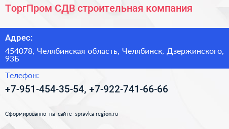 ТоргПром СДВ, строительная компания по адресу 454078, Челябинская область, Челябинск, Дзержинского, 93Б в дальнейшем Организация, размещена в следующих категориях: