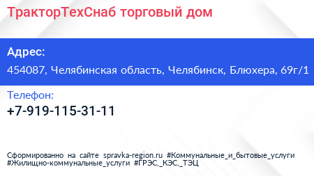 ТракторТехСнаб, торговый дом по адресу 454087, Челябинская область, Челябинск, Блюхера, 69г/1 в дальнейшем Организация, размещена в следующих категориях: