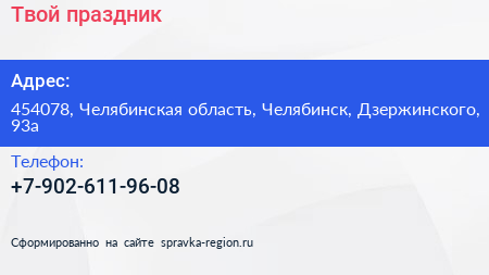 Твой праздник по адресу 454078, Челябинская область, Челябинск, Дзержинского, 93а в дальнейшем Организация, размещена в следующих категориях: