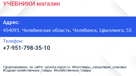 УЧЕБНИКИ, магазин по адресу 454091, Челябинская область, Челябинск, Цвиллинга, 53 в дальнейшем Организация, размещена в следующих категориях: