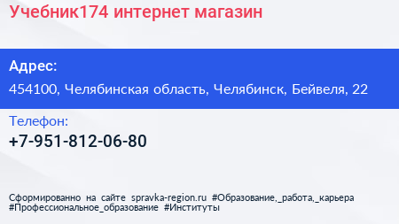 Учебник174, интернет-магазин по адресу 454100, Челябинская область, Челябинск, Бейвеля, 22 в дальнейшем Организация, размещена в следующих категориях: