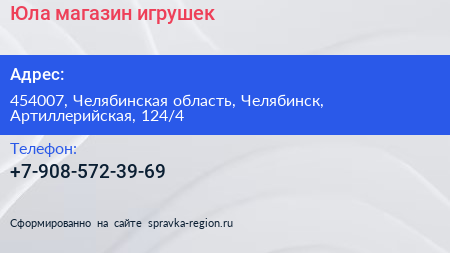 Юла, магазин игрушек по адресу 454007, Челябинская область, Челябинск, Артиллерийская, 124/4 в дальнейшем Организация, размещена в следующих категориях:
