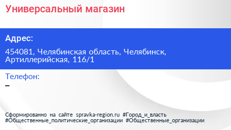 Универсальный магазин по адресу 454081, Челябинская область, Челябинск, Артиллерийская, 116/1 в дальнейшем Организация, размещена в следующих категориях:
