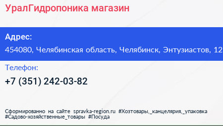 УралГидропоника, магазин по адресу 454080, Челябинская область, Челябинск, Энтузиастов, 12 в дальнейшем Организация, размещена в следующих категориях:
