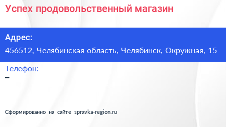 Успех, продовольственный магазин по адресу 456512, Челябинская область, Челябинск, Окружная, 15 в дальнейшем Организация, размещена в следующих категориях:
