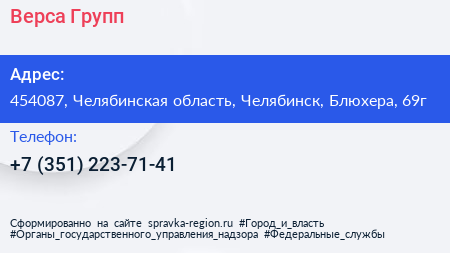 Верса-Групп по адресу 454087, Челябинская область, Челябинск, Блюхера, 69г в дальнейшем Организация, размещена в следующих категориях: