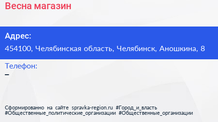 Весна, магазин по адресу 454100, Челябинская область, Челябинск, Аношкина, 8 в дальнейшем Организация, размещена в следующих категориях: