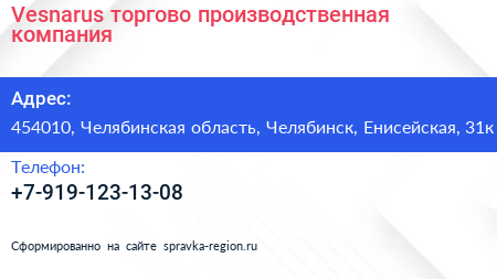 Vesnarus, торгово-производственная компания по адресу 454010, Челябинская область, Челябинск, Енисейская, 31к в дальнейшем Организация, размещена в следующих категориях: