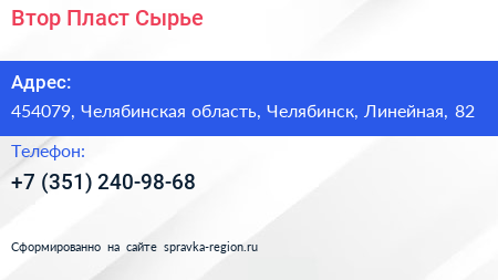 Втор Пласт Сырье по адресу 454079, Челябинская область, Челябинск, Линейная, 82 в дальнейшем Организация, размещена в следующих категориях:
