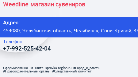 Weedline, магазин сувениров по адресу 454080, Челябинская область, Челябинск, Сони Кривой, 46 в дальнейшем Организация, размещена в следующих категориях: