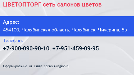ЦВЕТОПТОРГ, сеть салонов цветов по адресу 454100, Челябинская область, Челябинск, Чичерина, 5в в дальнейшем Организация, размещена в следующих категориях: